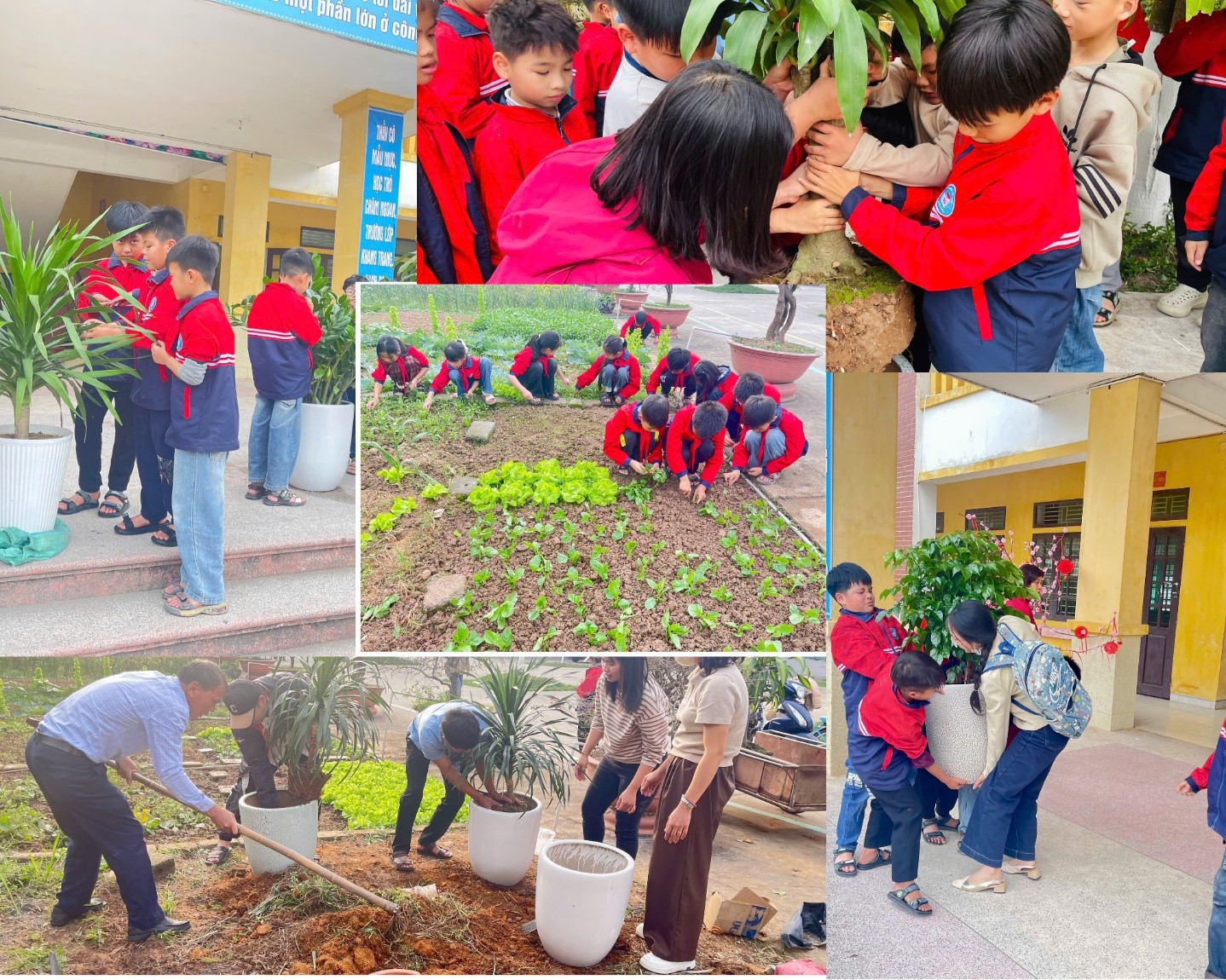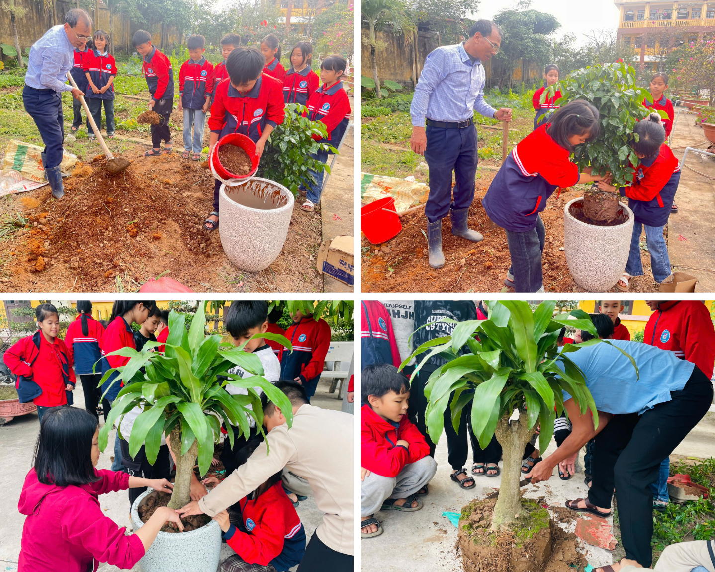 Ngay từ sáng sớm, khuôn viên nhà trường đã rộn ràng tiếng nói cười. Thầy cô, phụ huynh và các em học sinh cùng nhau chuẩn bị đất, đặt cây, vun gốc, tưới nước. Những đôi tay nhỏ bé nâng niu từng mầm cây non; những bàn tay người lớn ân cần hướng dẫn, hỗ trợ – tất cả hòa quyện tạo nên một hình ảnh đẹp về tinh thần đoàn kết và sự đồng hành trong giáo dục.
