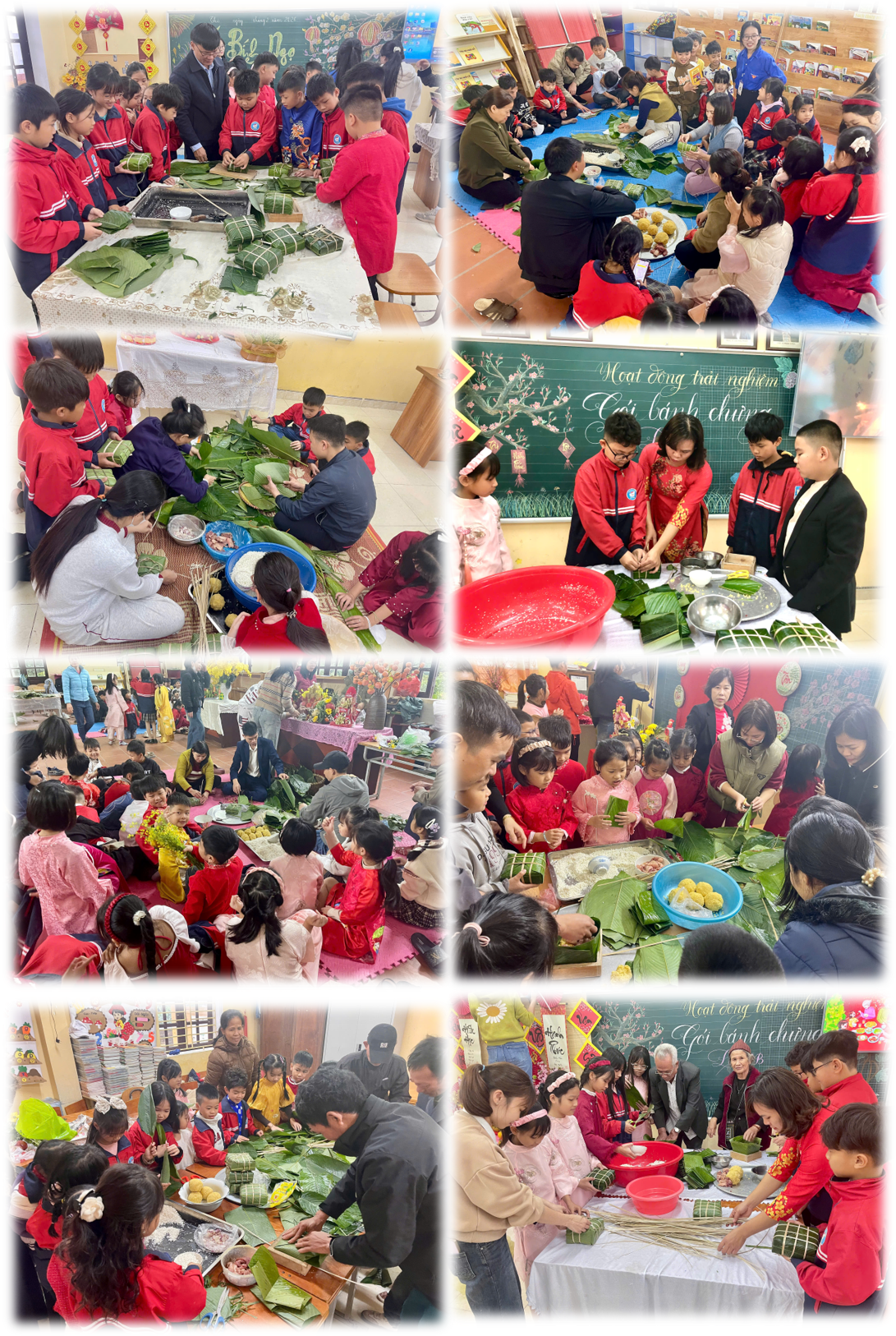 Ảnh: Thầy cô, phụ huynh và học sinh cùng gói bánh chưng đón xuân.