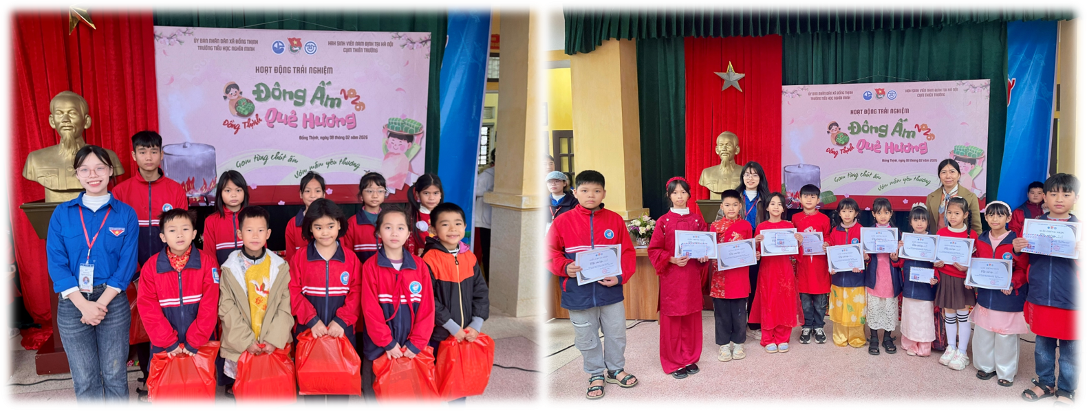 Ảnh: Hội Sinh viên tình nguyện cụm Thiên Trường đã trao tặng những phần quà ý nghĩa tới các em học sinh có hoàn cảnh khó khăn (bên trái) và trao quà tặng giải cho các lớp trong hội thi “Góc Tết xanh” (bên phải)