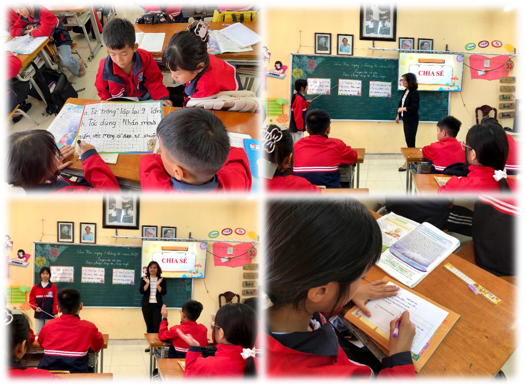 Trong quá trình thiết kế kế hoạch bài dạy, tổ CM tận dụng AI như một công cụ hỗ trợ đắc lực để hệ thống hóa kiến thức, xây dựng câu hỏi gợi mở và thiết kế chuỗi hoạt động học tập phù hợp với năng lực của học sinh lớp 5. Kế hoạch bài dạy được thiết kế khoa học, chú trọng đến việc “học sinh làm trung tâm”, tăng thời lượng cho các hoạt động thực hành, trải nghiệm và vận dụng. Tiết học được triển khai linh hoạt thông qua nhiều kĩ thuật và phương pháp dạy học tích cực như Tia chớp, Bể cá…Việc sử dụng phiếu học tập cá nhân và phiếu học tập nhóm cũng là một biện pháp giúp HS chủ động hơn trong các hoạt động học tập. Với phiếu cá nhân, học sinh tự đọc, tự phát hiện và phân tích biện pháp điệp từ, điệp ngữ trong các đoạn văn, câu thơ cụ thể. Với phiếu nhóm, các em cùng nhau trao đổi, thảo luận, thống nhất ý kiến và vận dụng biện pháp tu từ để sáng tạo câu văn của riêng mình. Qua hoạt động này, học sinh không chỉ nắm chắc kiến thức mà còn được rèn luyện kỹ năng giao tiếp, hợp tác và tư duy ngôn ngữ.