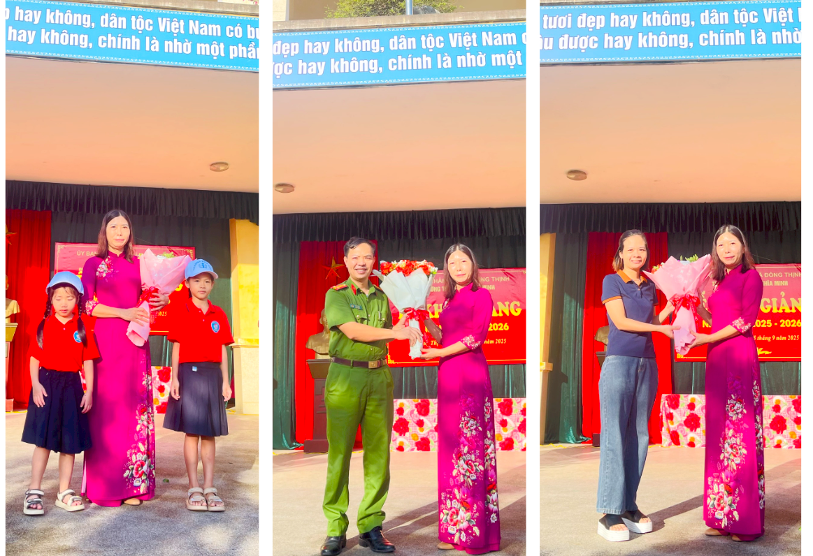 Tiếp nối chương trình, đại diện học sinh và khách mời đã dâng những lẵng hoa tươi thắm thay cho lời chúc mừng, gửi gắm niềm tin yêu tới thầy và trò nhà trường trong hành trình mới.